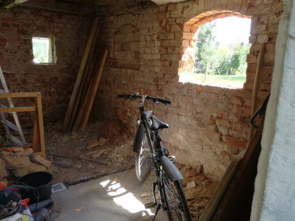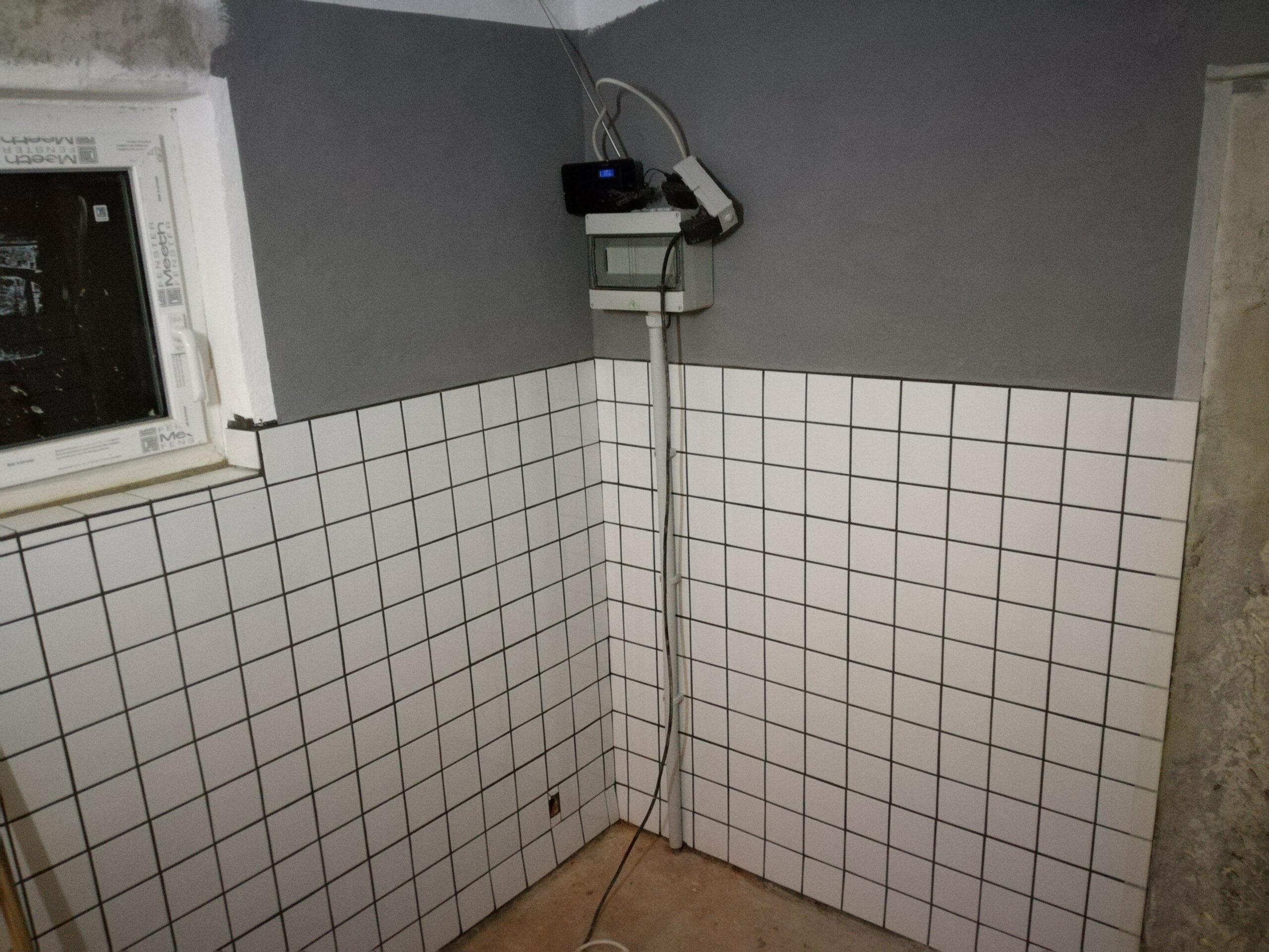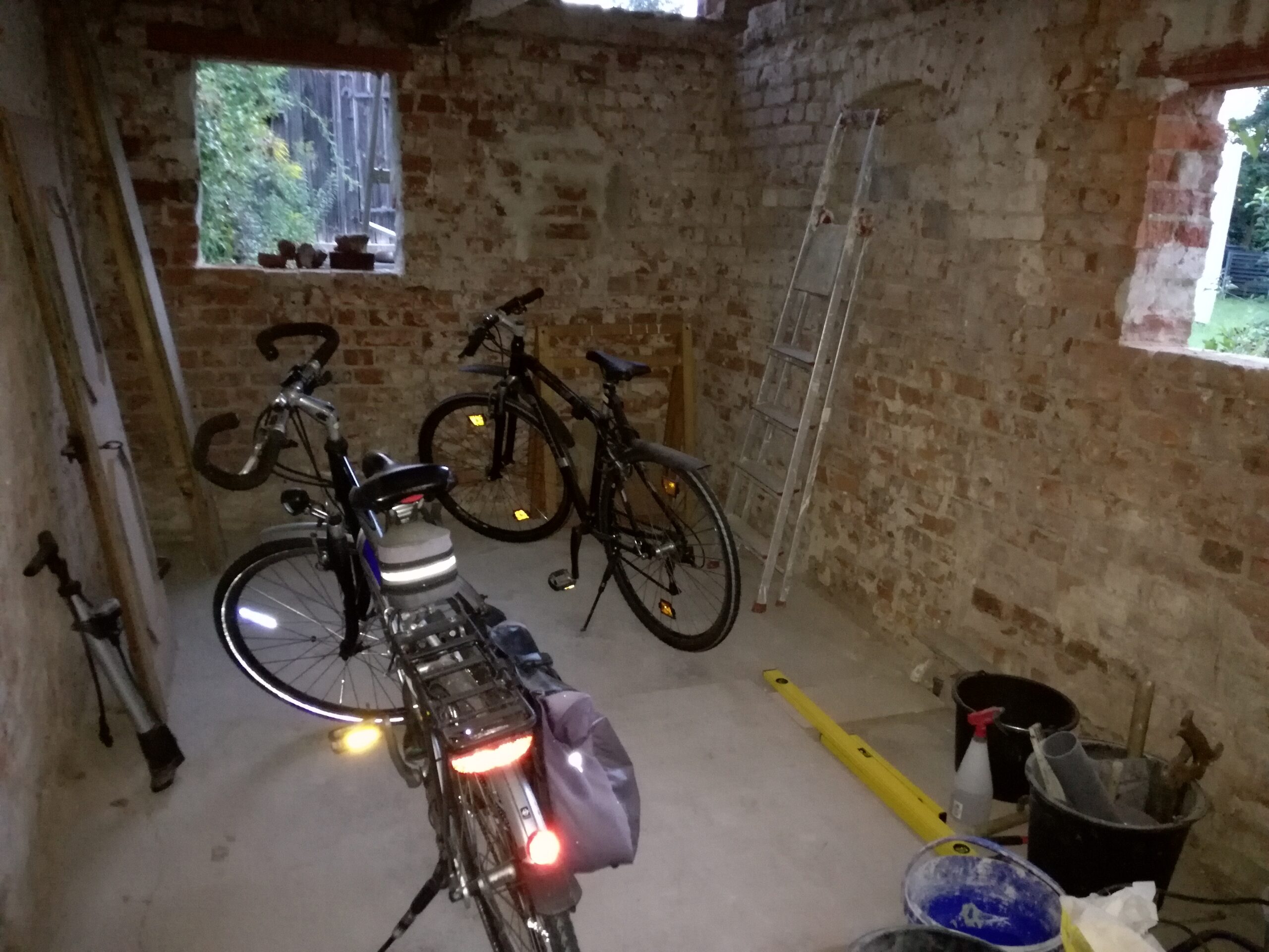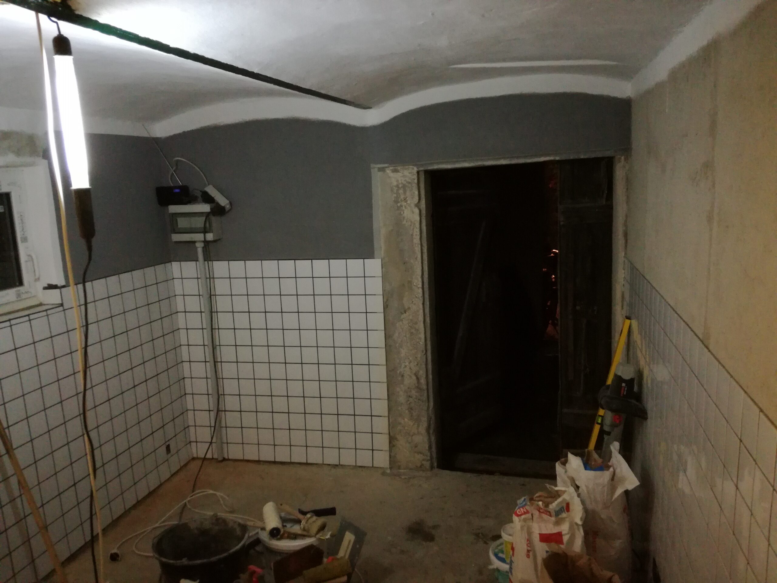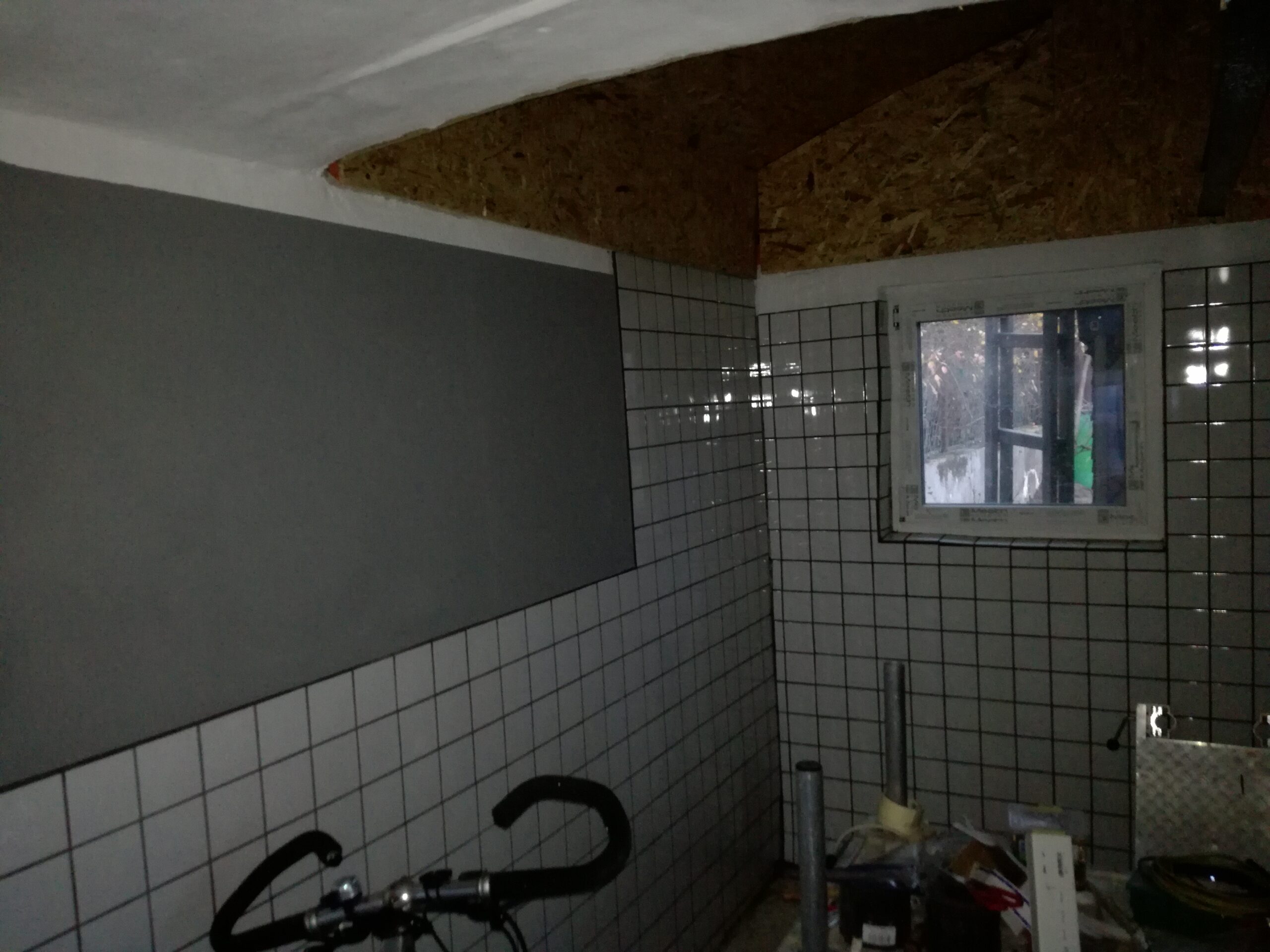 Eingang zum ehem. HühnerstallPutz bereits teilweise entfernt. Alte Fenster im hinteren Teil.Zwischennutzung als FahrradgarageHinterer Teil: Decke geöffnetBodenabfluss gelegtAußen, Fenster vorneDen alten Bogen konnte ich leider nicht erhalten.Hinteres, kleines Fenster zugemauertSchutt entferntWaren immerhin 1,5 Tonnen.Normfenster eingebautWände innen verputzt, teilweise gefliest und gestrichen.Hach…Nebeneingangstür eingebautVerkabelungLeiter zum LagerbereichLagerbereichVorbereitung für VenturiabzugVerkabelung stehtAbflussarbeiten