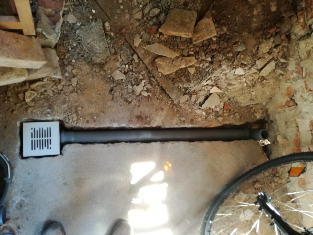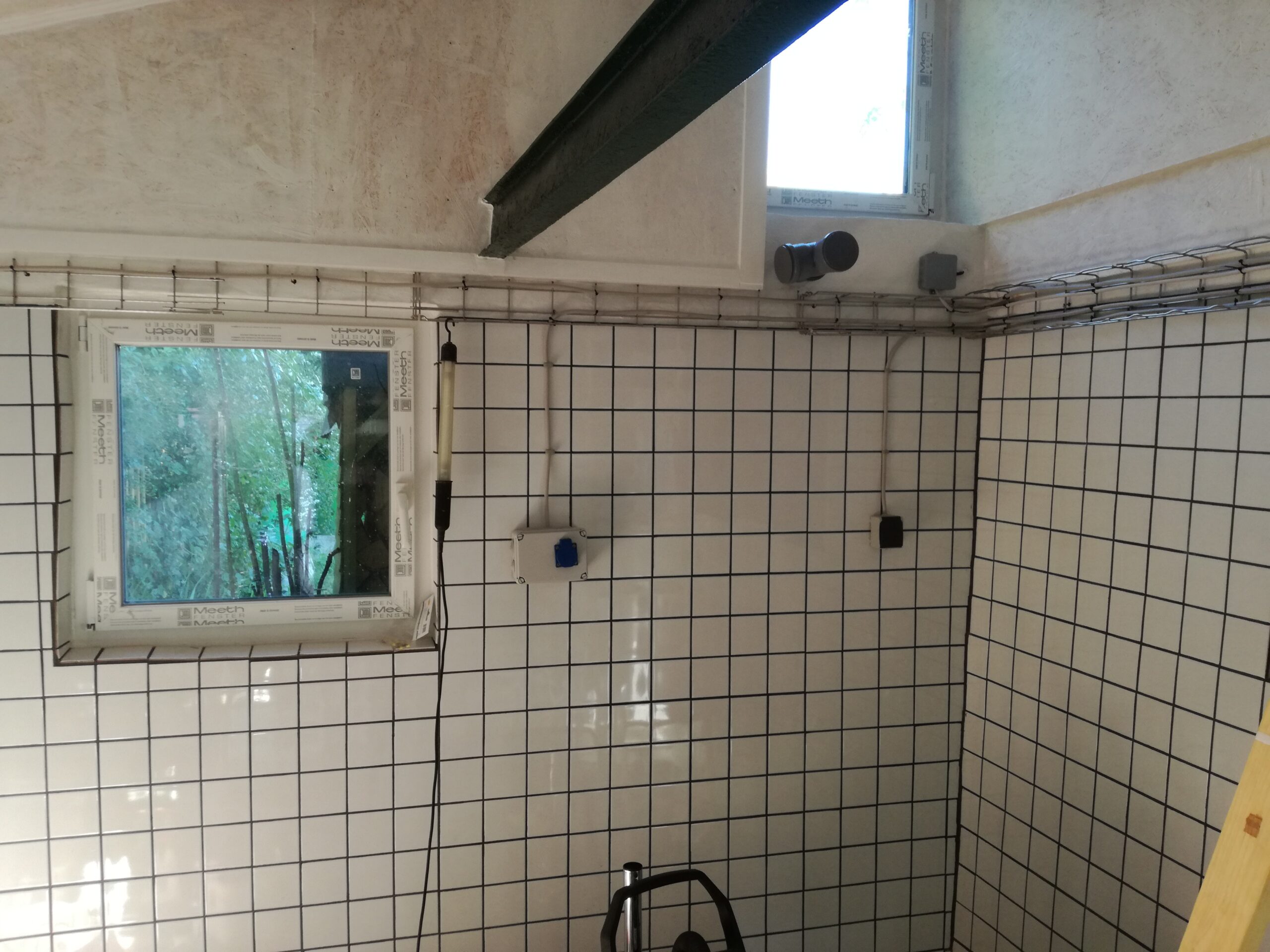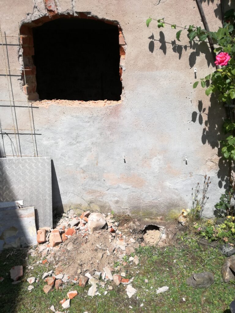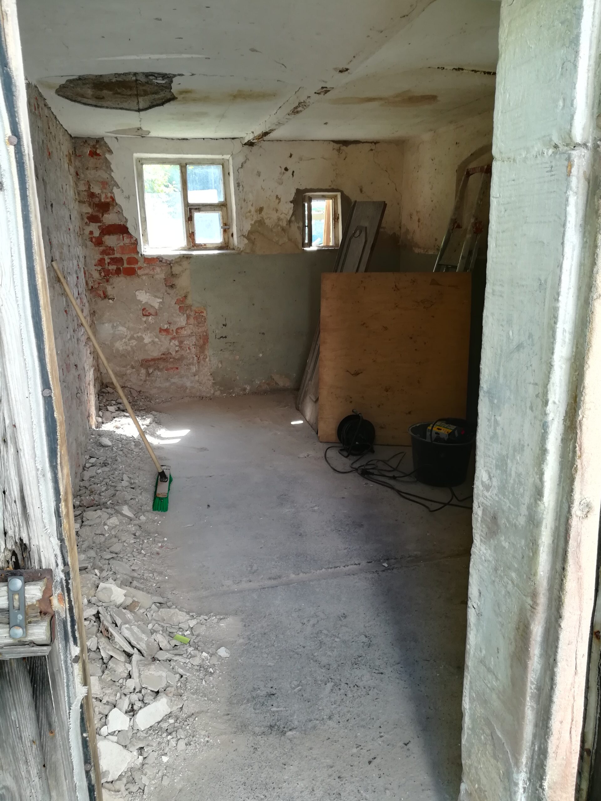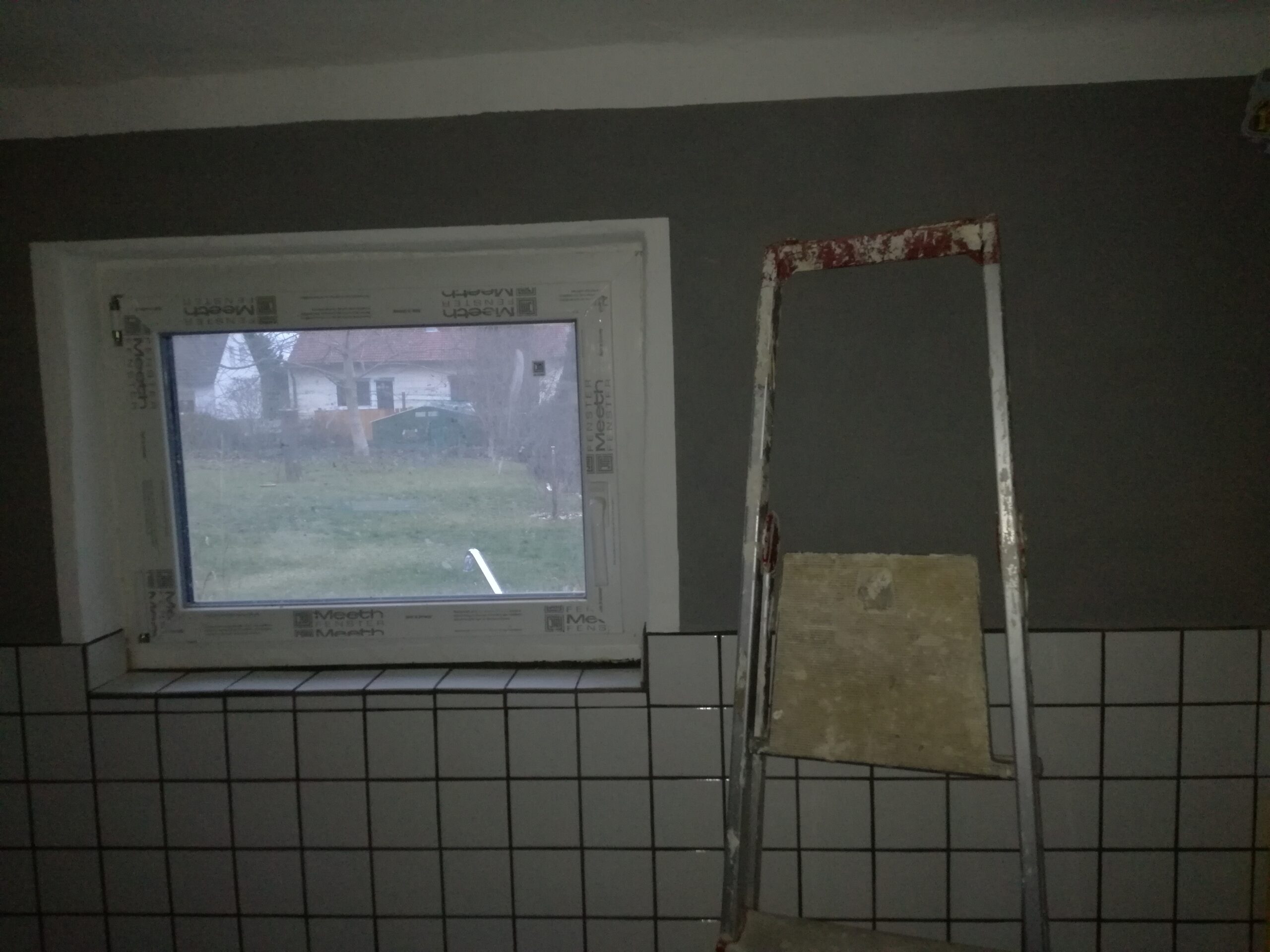 Eingang zum ehem. HühnerstallPutz bereits teilweise entfernt. Alte Fenster im hinteren Teil.Zwischennutzung als FahrradgarageHinterer Teil: Decke geöffnetBodenabfluss gelegtAußen, Fenster vorneDen alten Bogen konnte ich leider nicht erhalten.Hinteres, kleines Fenster zugemauertSchutt entferntWaren immerhin 1,5 Tonnen.Normfenster eingebautWände innen verputzt, teilweise gefliest und gestrichen.Hach…Nebeneingangstür eingebautVerkabelungLeiter zum LagerbereichLagerbereichVorbereitung für VenturiabzugVerkabelung stehtAbflussarbeiten
