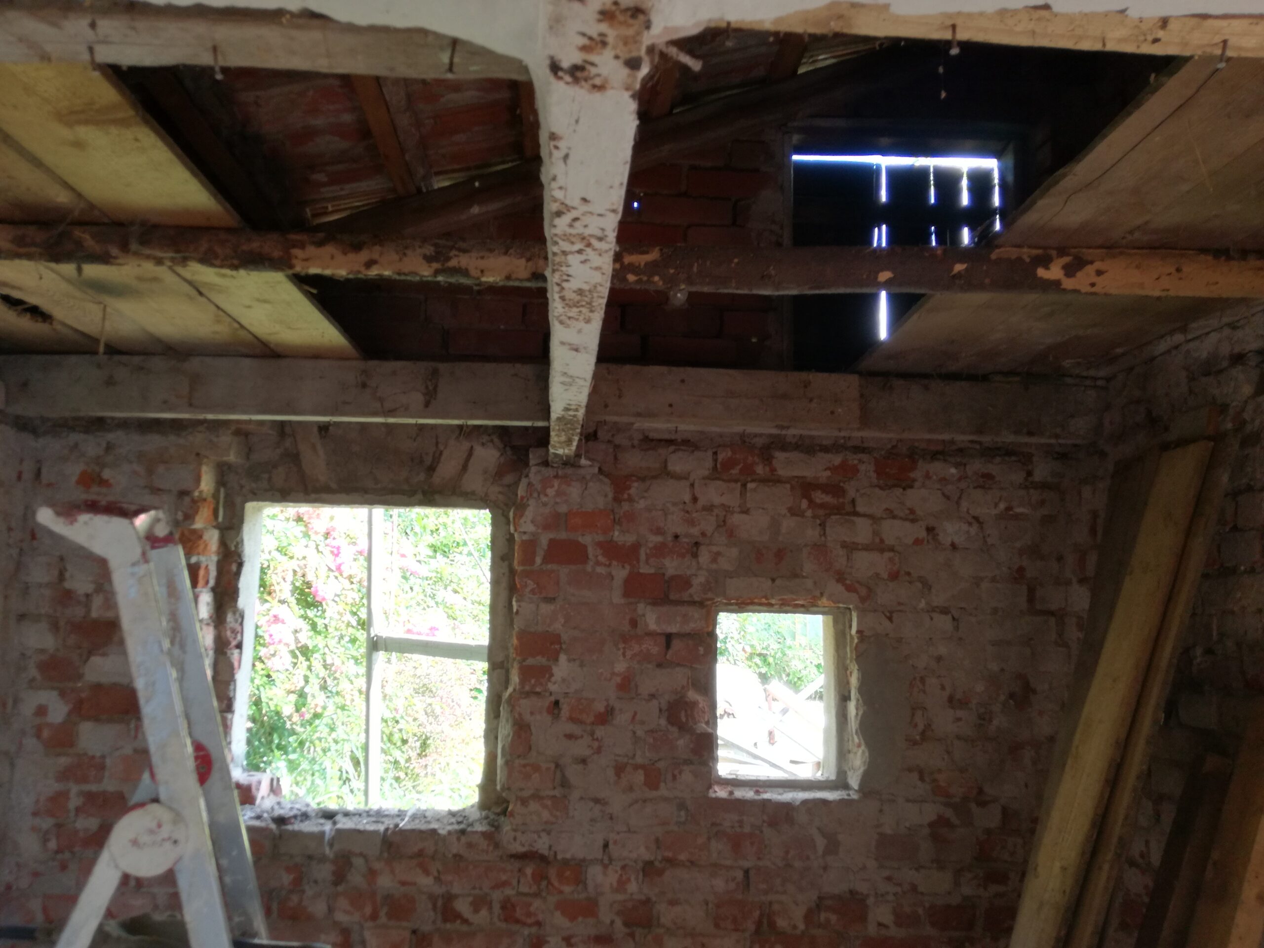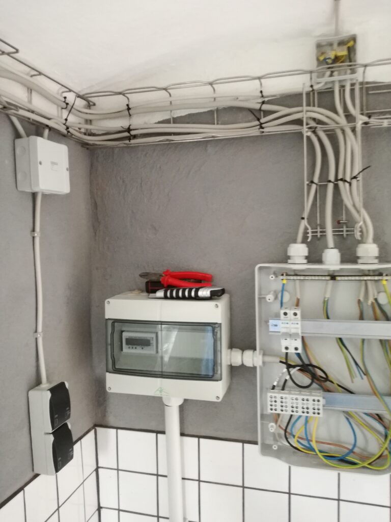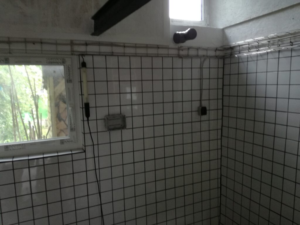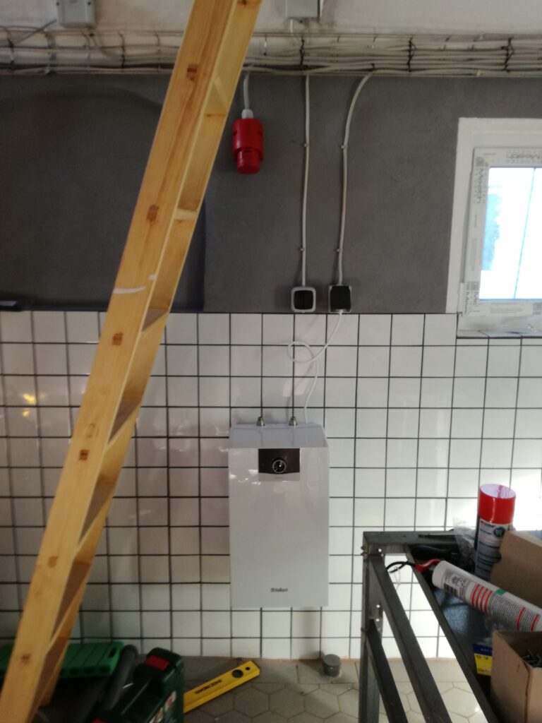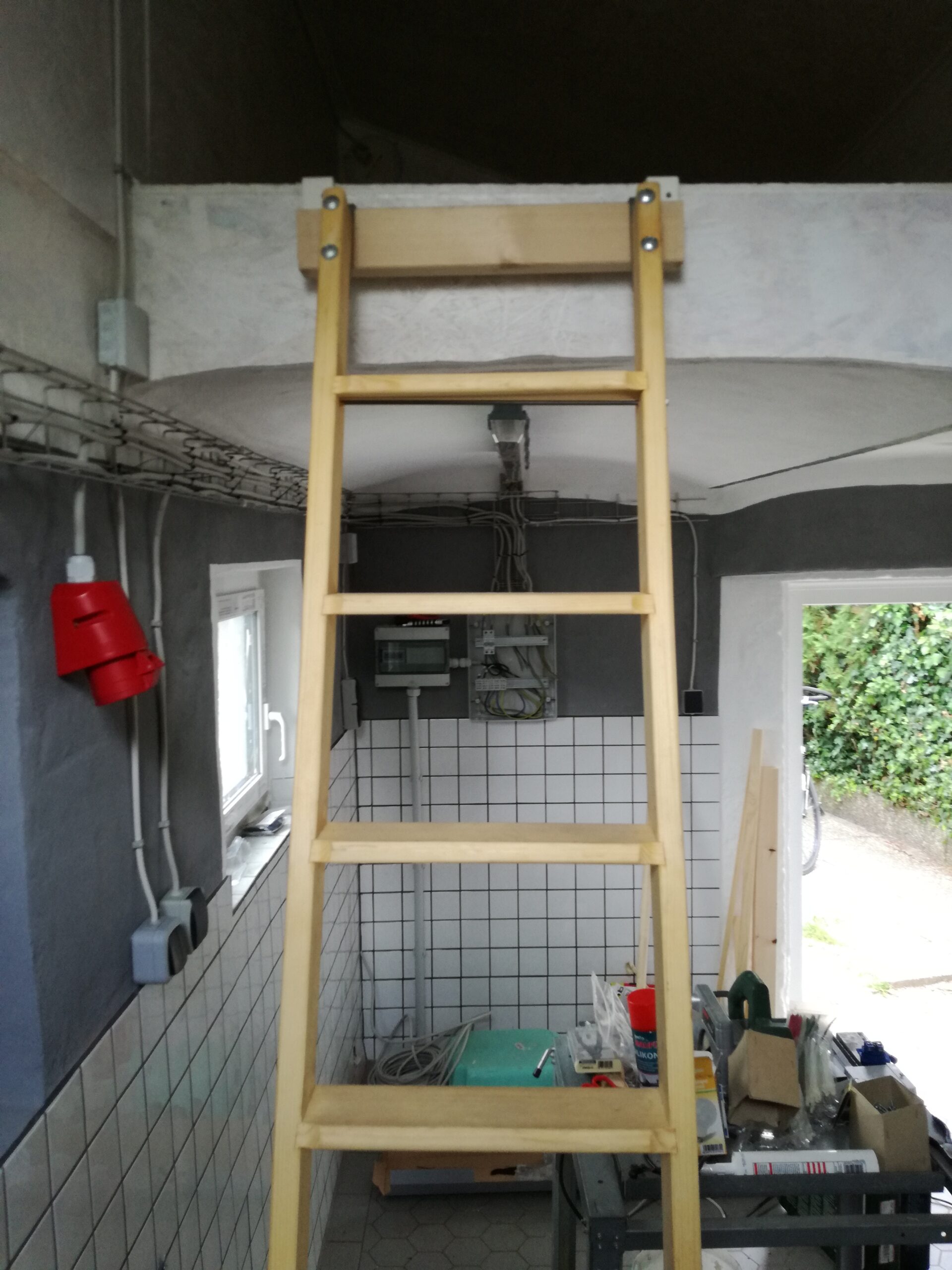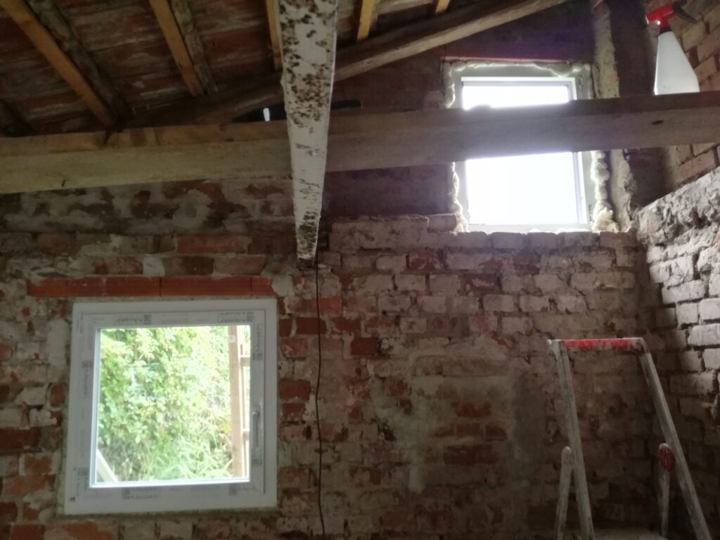 Eingang zum ehem. HühnerstallPutz bereits teilweise entfernt. Alte Fenster im hinteren Teil.Zwischennutzung als FahrradgarageHinterer Teil: Decke geöffnetBodenabfluss gelegtAußen, Fenster vorneDen alten Bogen konnte ich leider nicht erhalten.Hinteres, kleines Fenster zugemauertSchutt entferntWaren immerhin 1,5 Tonnen.Normfenster eingebautWände innen verputzt, teilweise gefliest und gestrichen.Hach…Nebeneingangstür eingebautVerkabelungLeiter zum LagerbereichLagerbereichVorbereitung für VenturiabzugVerkabelung stehtAbflussarbeiten